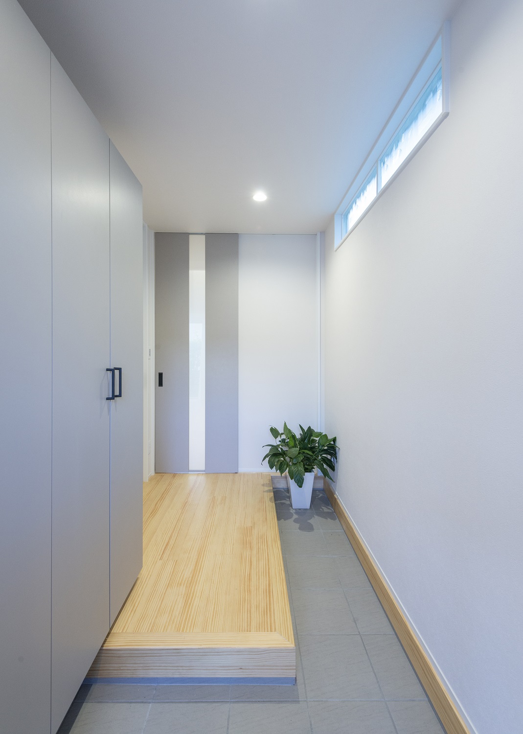 玄関はグレーで統一。L字型のホールで、ご家族並んでご帰宅可能。